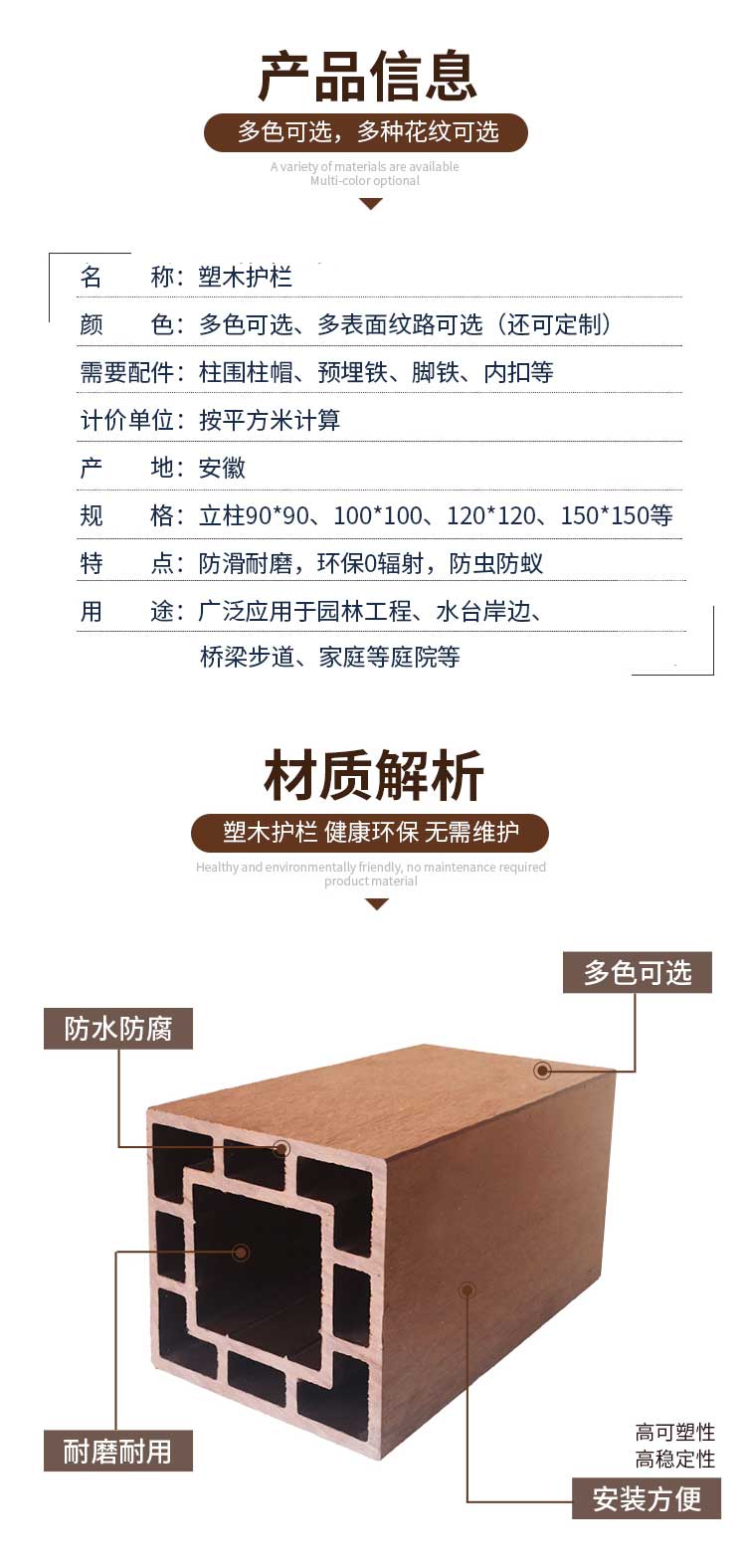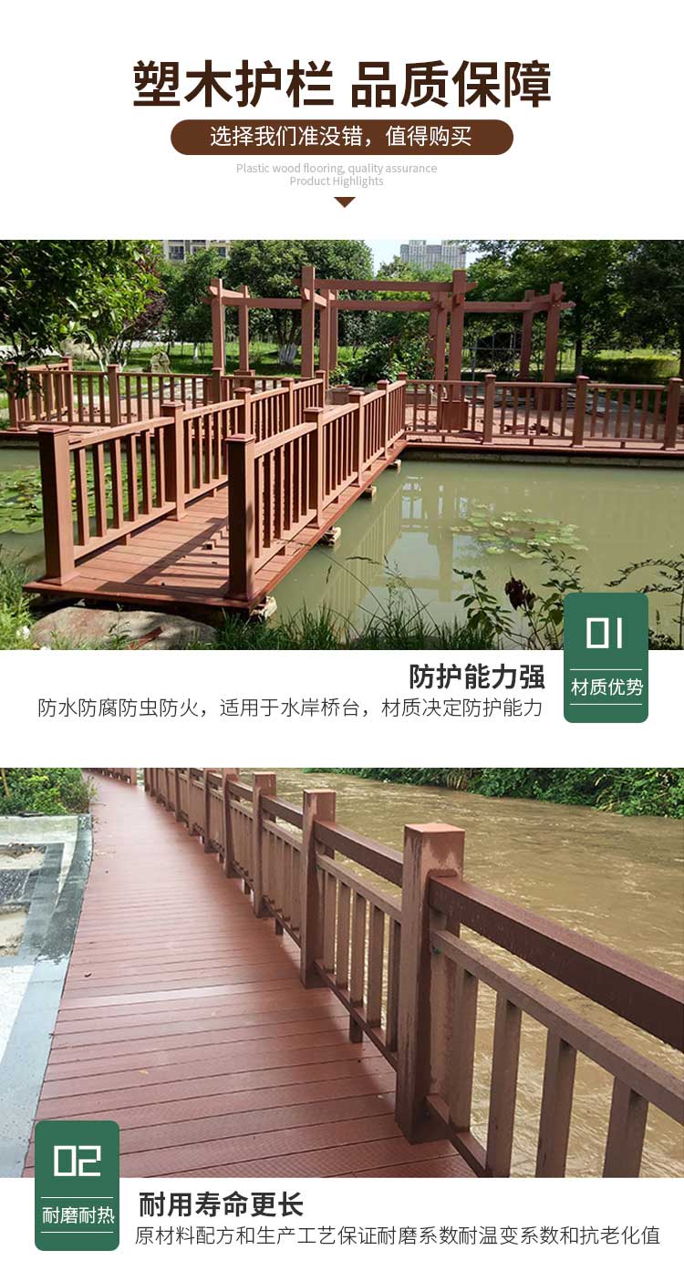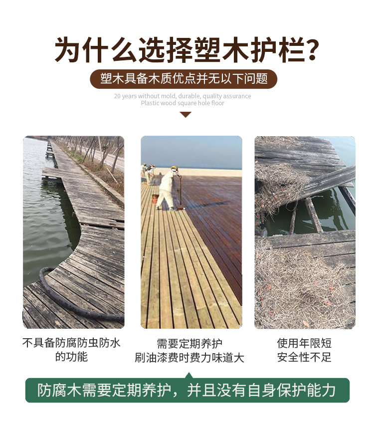 2.塑木護(hù)欄具有防水、防潮、耐腐蝕等特點(diǎn),防蟲、防白蟻,有效杜絕蟲類騷擾。
