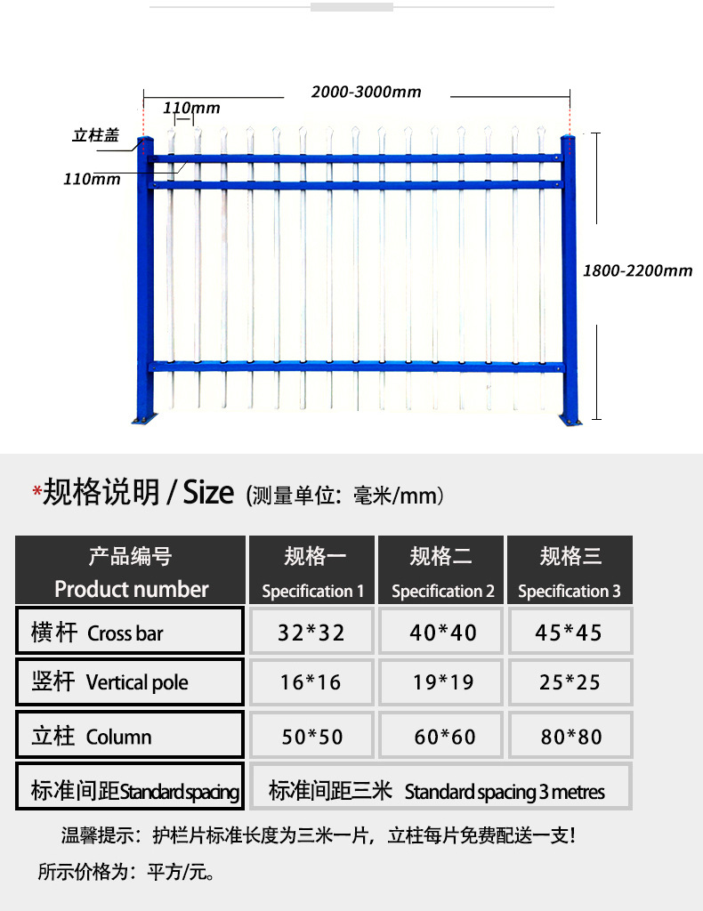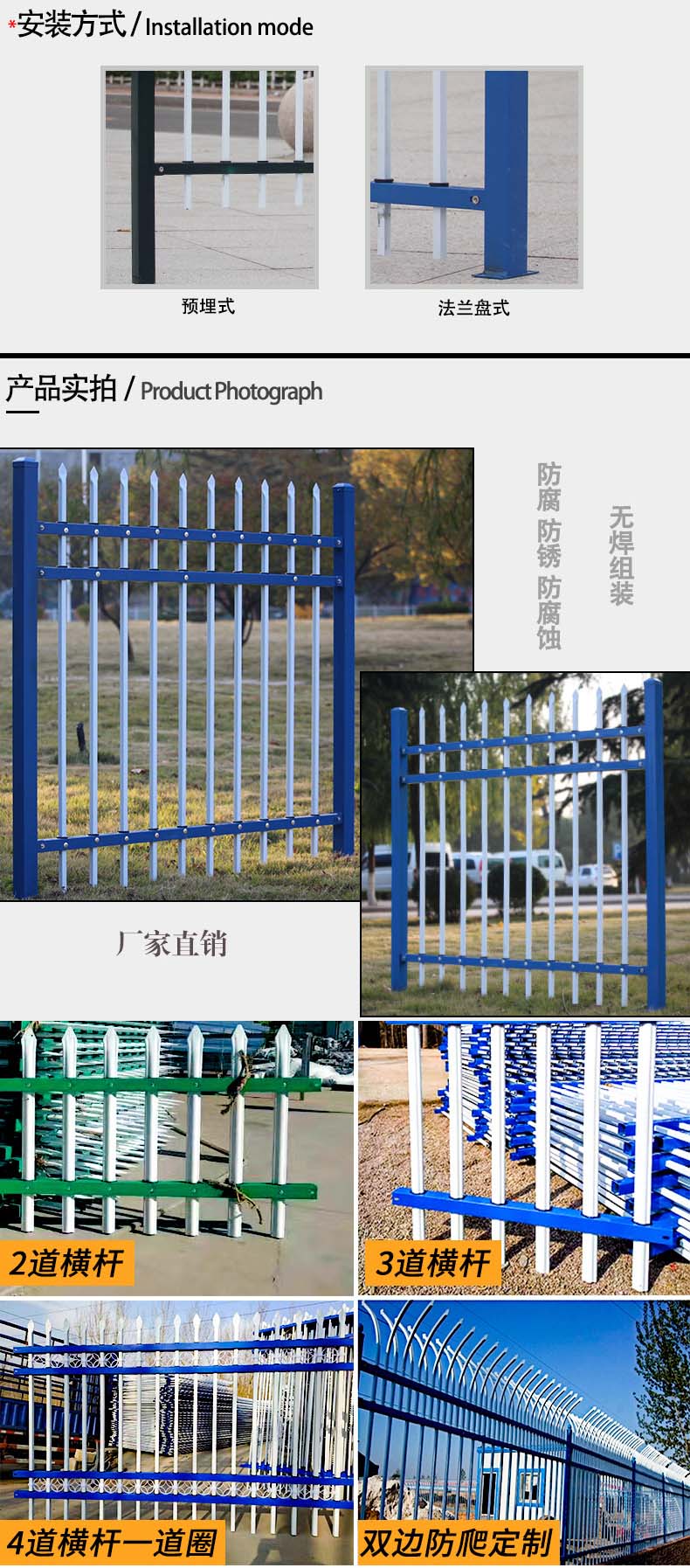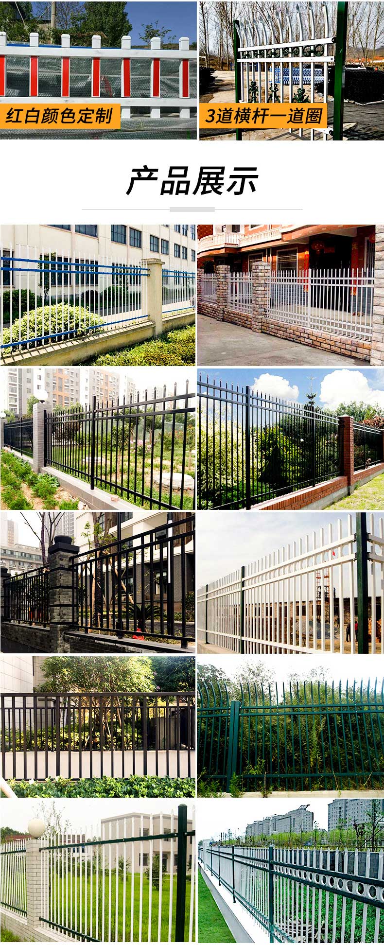 組成:新型柵欄,由不同規(guī)格的方管組裝而成,使用的材料均為熱鍍鋅鋼管進行靜電噴涂處理.靜電噴涂柵欄由鋼管、不銹鋼防盜螺栓和各種裝飾圈組成。