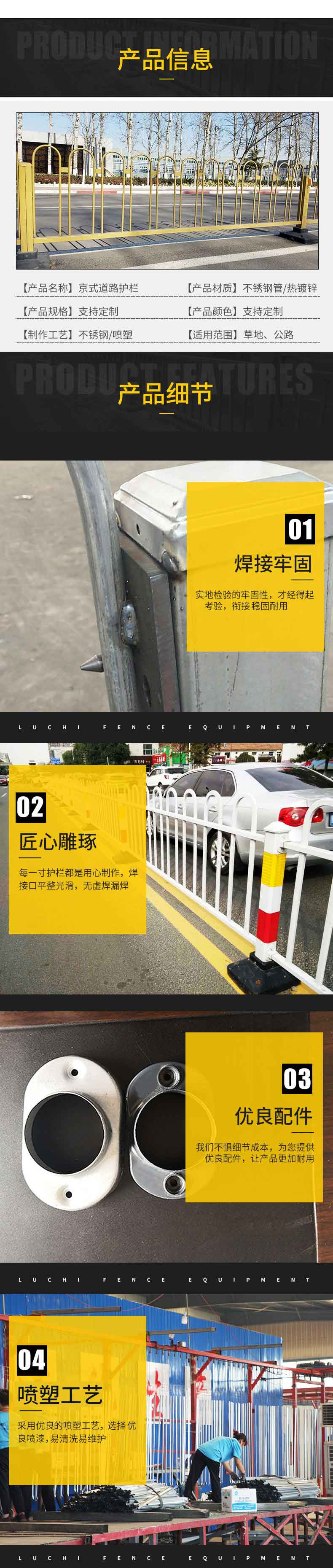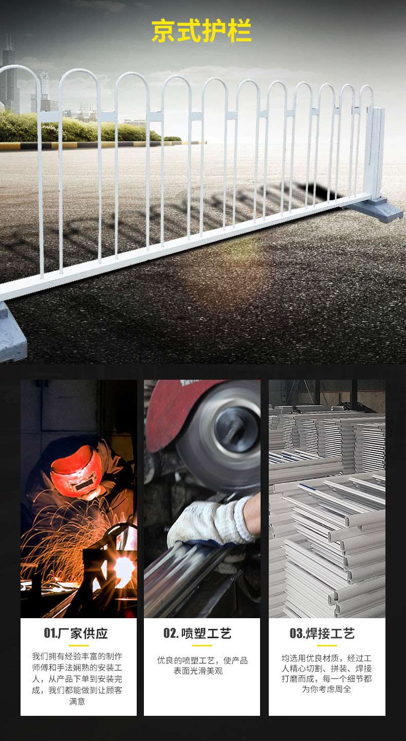 京式護(hù)欄主要用于場區(qū)隔離帶,市政工程隔離帶,園林護(hù)欄;市政建設(shè)中的公園、草坪、動物園、池湖、道路、及住宅區(qū)的隔離與防護(hù);賓館、酒店、超市、娛樂場所的防護(hù)與裝飾。組成:新型柵欄,由不同規(guī)格的方管組裝而成,使用的材料均為熱鍍鋅鋼管進(jìn)行靜電噴涂處理,靜電噴涂柵欄由鋼管、不銹鋼防盜螺栓和各種裝飾圈組成。