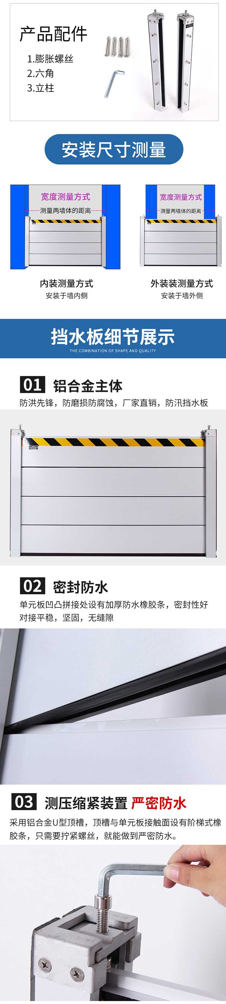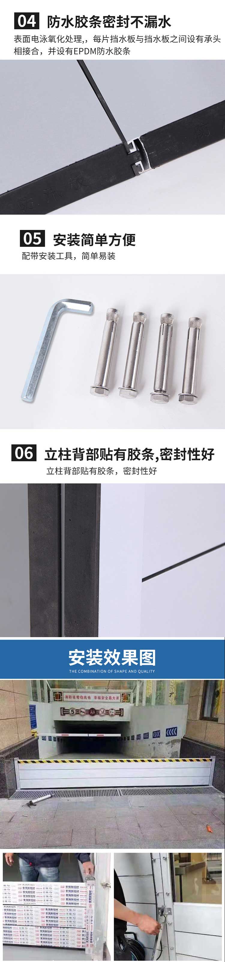 材質(zhì):主材防汛擋板,固定立柱及中立柱,三角背撐直/斜撐采用鋁合金模具一體成型,止水膠條為三元乙丙橡膠(EPDM)模具一體成型,其他附件為304不銹鋼一體成型。