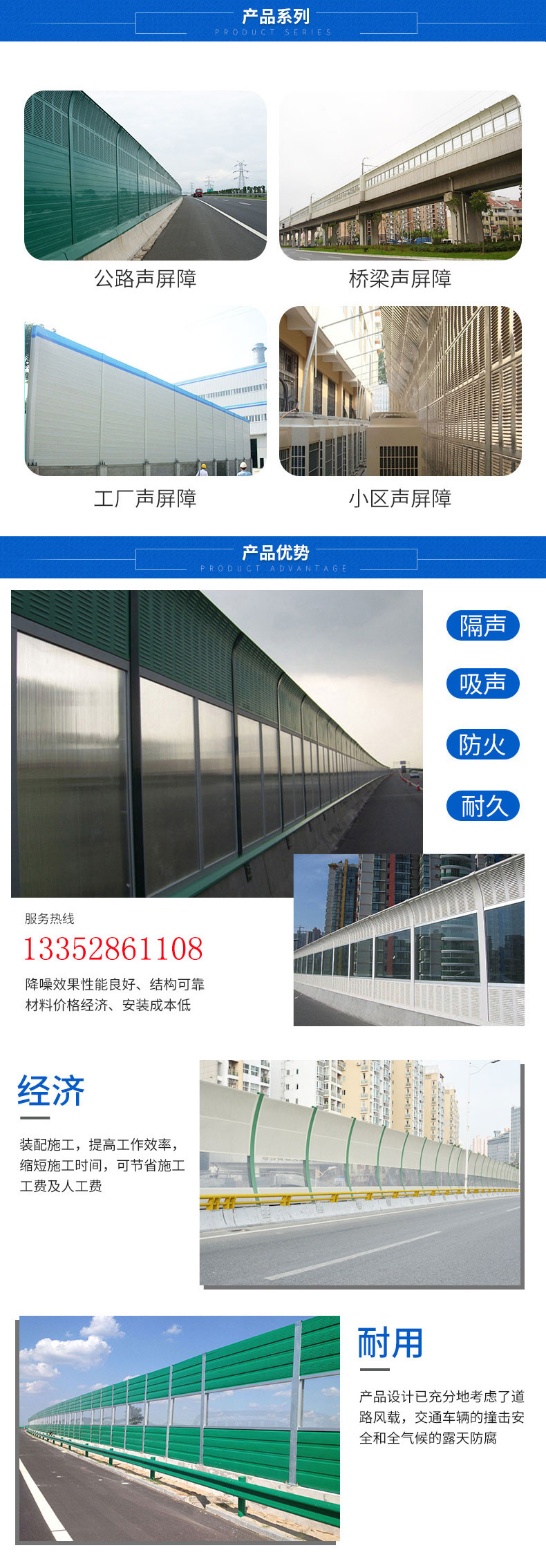 大多數(shù)的聲屏障都選用吸聲和隔聲混合型的產(chǎn)品,該型產(chǎn)品的特點(diǎn)是對(duì)道路噪聲的產(chǎn)生和傳遞特征有針對(duì)性地控制。